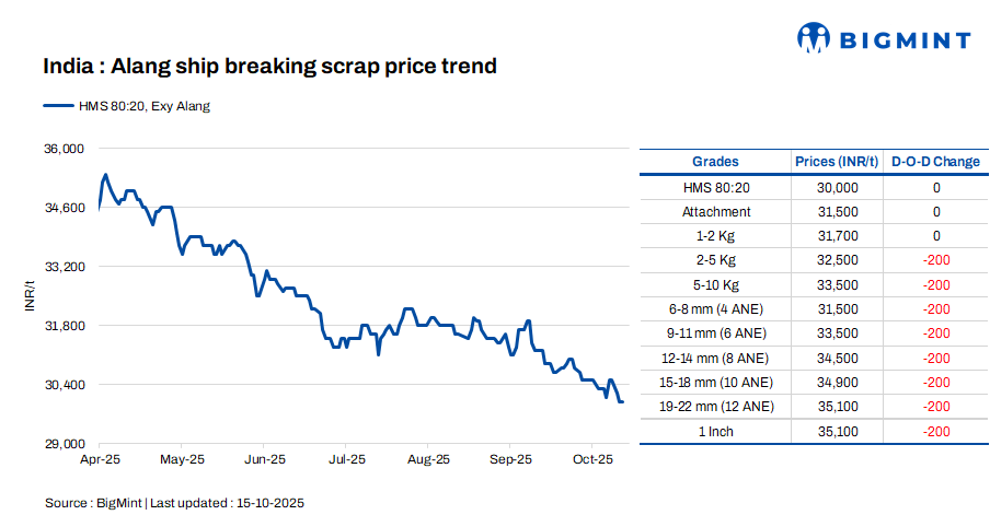 Ship-breaking melting scrap prices in Alang, Gujarat, remained stable d-o-d on 15 Oct’25. According to BigMint’s assessment, HMS (80:20) was at INR 30,000/t ($339/t) ex-yard. Semi-finished and finished steel prices held largely steady in the previous trading session in the region. That apart, moderate trade activity in scrap prompted suppliers to keep their offers unchanged today.
