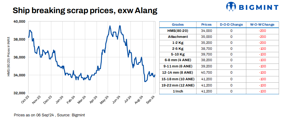 Ship-breaking melting scrap prices in Alang, Gujarat, remained stable d-o-d on 6 Sep’24. According to BigMint’s assessment, HMS (80:20) prices were at INR 34,000/t ($405/t) ex-yard. Prices of semi-finished and finished steel mostly remained firm in yesterday’s trading session in the region. This, as well as moderate trade activities for scrap, prompted suppliers to keep their offers unchanged today.