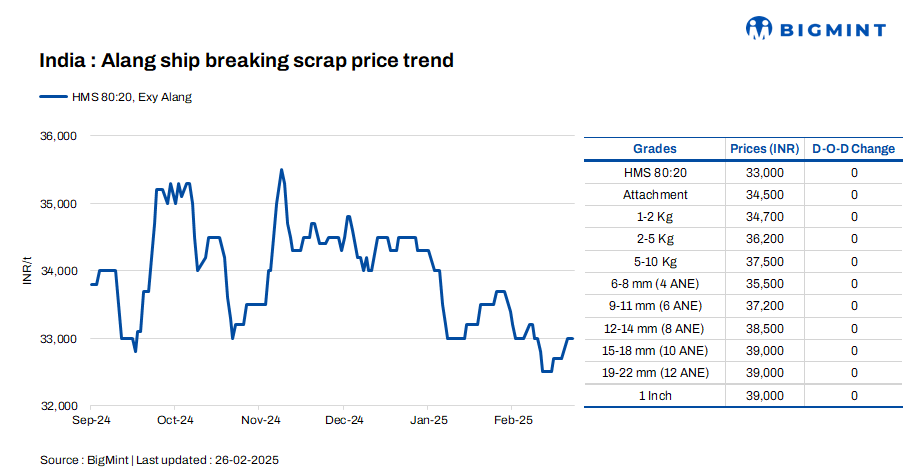 Ship-breaking melting scrap prices in Alang, Gujarat, remained stable d-o-d on 26 Feb’25. According to BigMint’s assessment, HMS (80:20) prices were at INR 33,000/t ($379/t) ex-yard. The region witnessed average trade activity for semi-finished and finished steel during yesterday’s trading session. Additionally, with moderate buying interest for scrap, suppliers opted to maintain steady prices today.