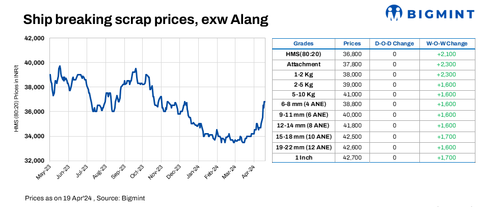 Ship-breaking melting scrap prices in Alang, Gujarat, remained stable d-o-d on 19 Apr’24. According to BigMint’s assessment, HMS (80:20) prices were at INR 36,800/t ($441/t) ex-yard. Though semi-finished steel prices remained stable in yesterday’s trading session in the region, moderate buying inquiries for scrap by the Bhavnagar-based IF steel mills prompted suppliers to keep offers stable today.