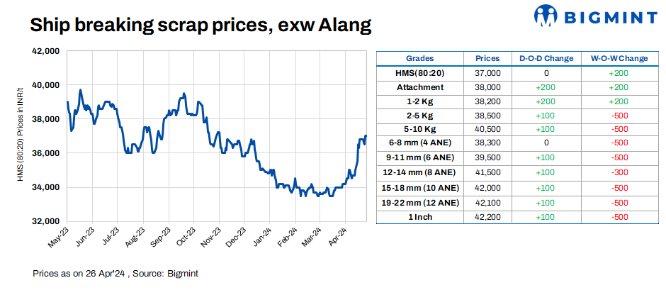 Ship-breaking melting scrap prices in Alang, Gujarat, remained stable d-o-d on 26 Apr’24. According to BigMint’s assessment, HMS (80:20) prices were at INR 37,000/t ($444/t) ex-yard. Although semi-finished steel prices increased in yesterday’s session in the region, trade activities remained moderate. Meanwhile, trade activities in scrap were at a modest level, prompting suppliers to maintain stable prices today.