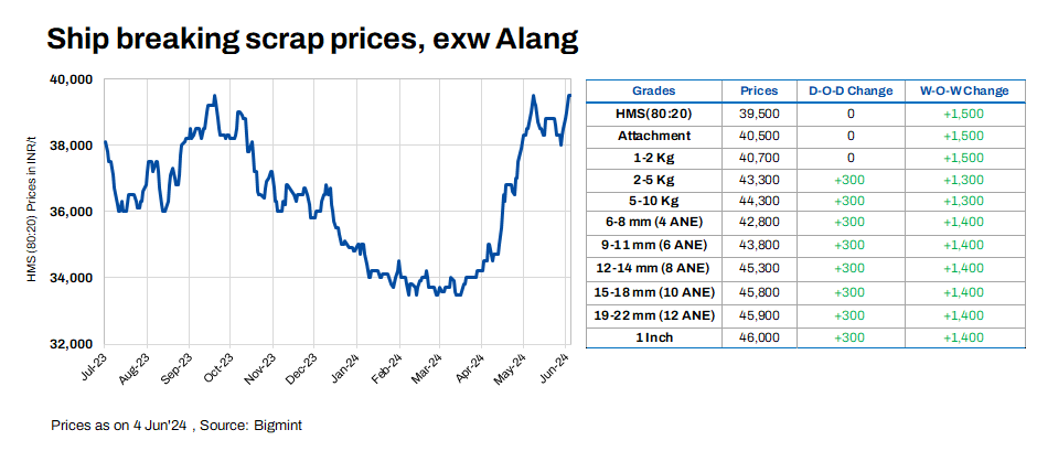 Ship-breaking melting scrap prices in Alang, Gujarat, remained stable d-o-d on 4 Jun’24. According to BigMint’s assessment, HMS (80:20) prices were at INR 39,500/t ($474/t) ex-yard. Average trade activity was observed for semi-finished and finished steel during yesterday’s trading session in the region. Additionally, moderate buying inquiries for scrap by Bhavnagar-based IF steel mills prompted suppliers to keep their offers stable today.