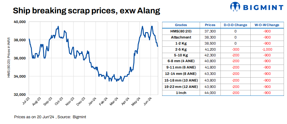 Ship-breaking melting scrap prices in Alang, Gujarat, remained stable d-o-d on 20 Jun’24. According to BigMint’s assessment, HMS (80:20) prices were at INR 37,300/t ($447/t) ex-yard. Though semi-finished steel prices decreased in yesterday’s trading session in the region, limited availability of scrap and moderate buying inquiries by the Bhavnagar-based IF steel mills prompted suppliers to keep offers stable today.