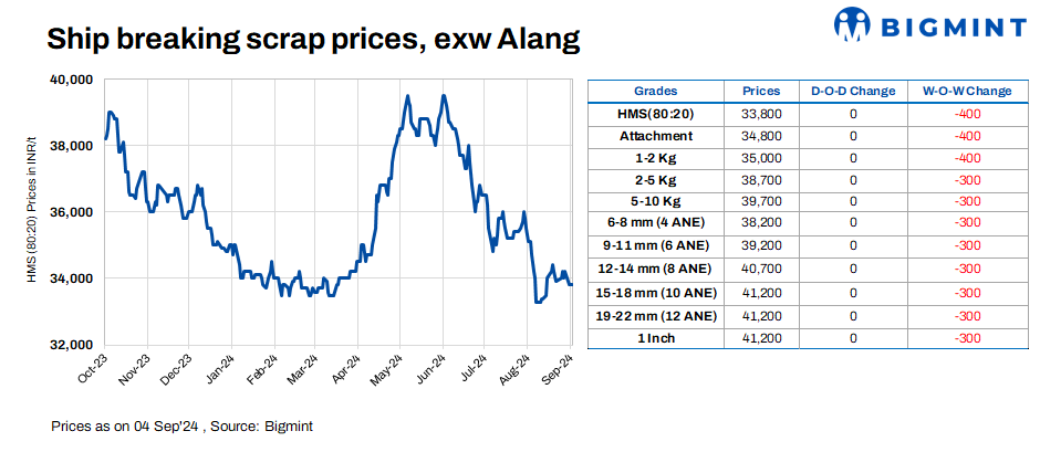 Ship-breaking melting scrap prices in Alang, Gujarat, remained stable d-o-d on 4 Sep’24. According to BigMint’s assessment, HMS (80:20) prices were at INR 33,800/t ($403/t) ex-yard. Prices of semi-finished and finished steel remained almost firm in the region during the yesterday’s trading session. In addition, moderate trade activity for scrap prompted suppliers to keep their offers stable today.
