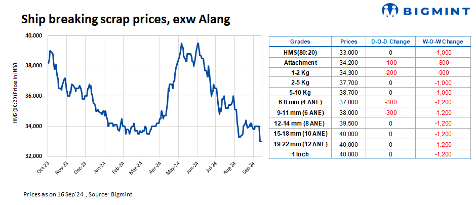 Ship-breaking melting scrap prices in Alang, Gujarat, remained stable d-o-d on 16 Sep’24. According to BigMint’s assessment, HMS (80:20) prices stood at INR 33,000/t ($393/t) ex-yard. Although prices of semi-finished steel decreased in the previous trading session in the region, moderate buying inquiries for scrap by Bhavnagar-based IF steel mills prompted suppliers to keep offers stable today.