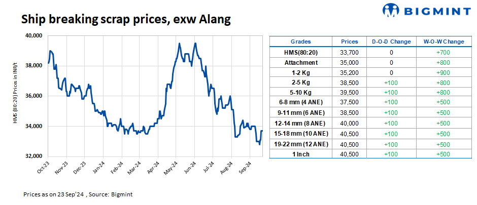 Ship-breaking melting scrap prices in Alang, Gujarat, remained stable d-o-d on 23 Sep’24. According to BigMint’s assessment, HMS (80:20) prices were at INR 33,700/t ($404/t) ex-yard. Moderate trade activities were observed for semi-finished and finished steels in the region during the last trading session. Additionally, decent buying activities for scrap from Bhavnagar-based mills, prompted suppliers to maintain stable prices today.