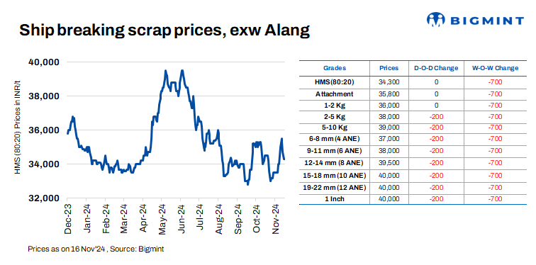 Ship-breaking melting scrap prices in Alang, Gujarat, remained stable d-o-d on 16 Nov’24. According to BigMint’s assessment, HMS (80:20) prices were at INR 34,300/t ($406/t) ex-yard. Average trade activity was observed for semi-finished and finished steel during yesterday’s trading session in the region. Additionally, moderate buying inquiries for scrap by Bhavnagar-based IF steel mills prompted suppliers to keep their offers stable today.