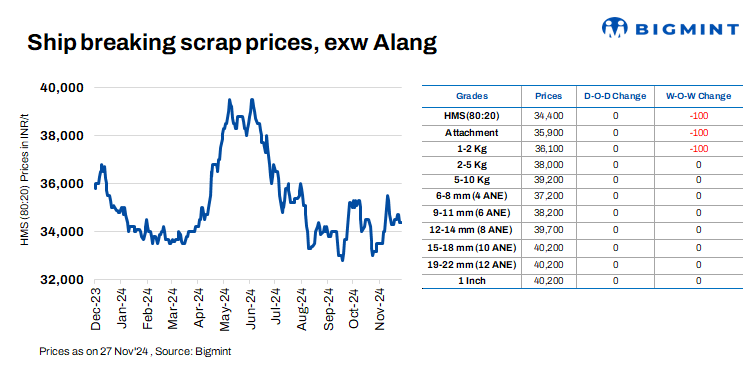 India’s ship-breaking melting scrap prices in Alang, Gujarat, remained stable d-o-d on 27 Nov’24. According to BigMint’s assessment, HMS (80:20) stood at INR 34,400/t ($407/t) ex-yard. According to sources, there is a significant shortage of scrap in the market. Imported scrap is unavailable, and only 20-25 ships are beached in Alang for dismantling. This situation led scrap suppliers to keep their offers stable today.