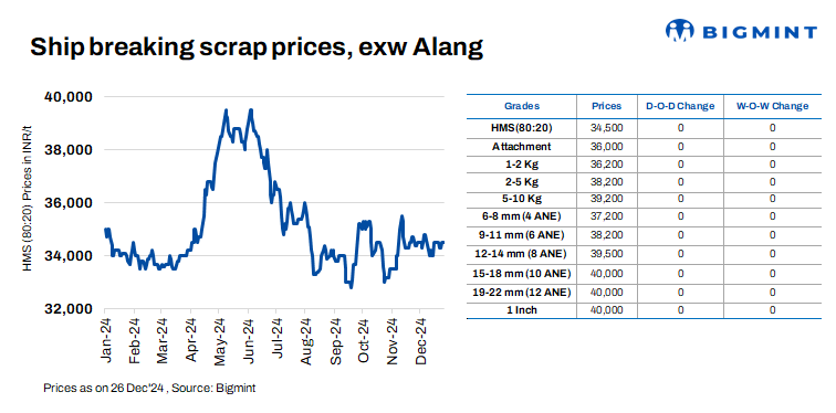 India’s ship-breaking melting scrap prices in Alang, Gujarat, remained stable d-o-d on 26 Dec’24. According to BigMint’s assessment, HMS (80:20) stood at INR 34,500/t ($405/t) ex-yard. In the previous trading session, the region saw average trade activity for both semi-finished and finished steel. This, coupled with moderate buying interest for scrap from Bhavnagar-based IF steel mills, drove suppliers to maintain steady prices today.