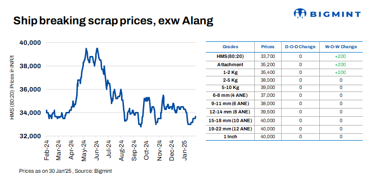 Ship-breaking melting scrap prices in Alang, Gujarat, held steady d-o-d on 30 Jan’25. According to BigMint’s assessment, HMS (80:20) stood at INR 33,700/t ($389/t) ex-yard. Prices of semi-finished and finished steel remained firm in the region during yesterday’s trading session. This, along with moderate trade activities for scrap, prompted suppliers to keep their offers stable today.