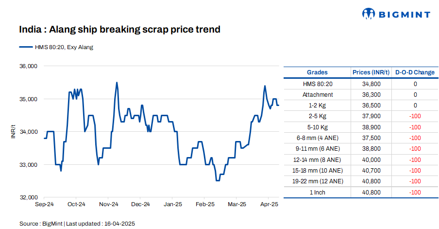 Ship-breaking melting scrap prices in Alang, Gujarat, remained steady d-o-d on 16 Apr’25. According to BigMint’s assessment, HMS (80:20) prices were at INR 34,800/t ($406/t) ex-yard. Trading activity in both semi-finished and finished steel remained moderate during the previous session. This, along with steady buying interest in scrap, encouraged suppliers to hold offers firm.