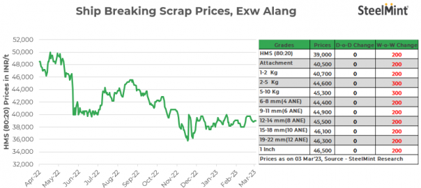 Shipbreaking melting scrap prices in Alang, Gujarat, remained stable d-o-d as per SteelMint’s assessment. HMS (80:20) prices are assessed at INR 39,000/t exy. Key markets in the northern and western regions saw lack of trades in semis and finished steel yesterday. Meanwhile, moderate buying interest for scrap at current prices prompted suppliers to keep their offers stable today.