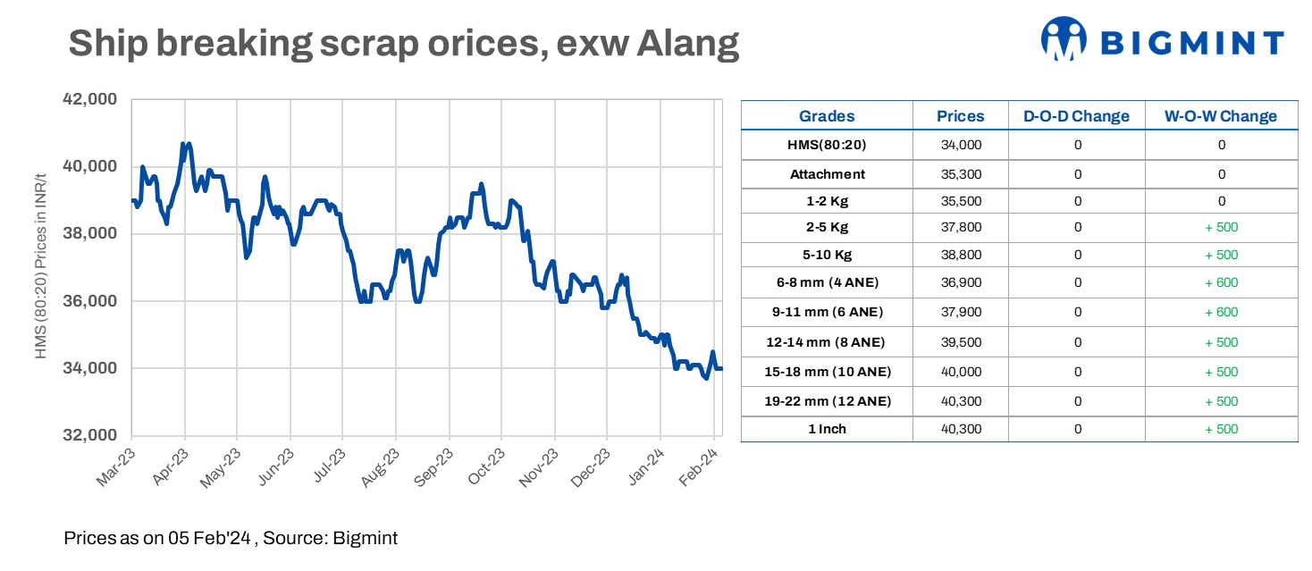 Ship-breaking melting scrap prices in Alang, Gujarat, remained stable d-o-d on 5 Feb’24. As per SteelMint’s assessment, HMS (80:20) prices stood at INR 34,000/t exy. Almost stable semi-finished steel prices in Gujarat in the last trading session and moderate buying inquiries for scrap in the region prompted scrap suppliers to keep offers firm today.