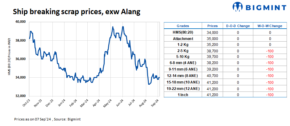Ship-breaking melting scrap prices in Alang, Gujarat, remained stable for the second consecutive day on 7 Sep’24. According to BigMint’s assessment, HMS (80:20) prices were at INR 34,000/t ($405/t) ex-yard. Though semi-finished steel prices fell in yesterday’s trading session in the region, moderate buying inquiries for scrap by Bhavnagar-based IF steel mills prompted suppliers to keep offers stable today.