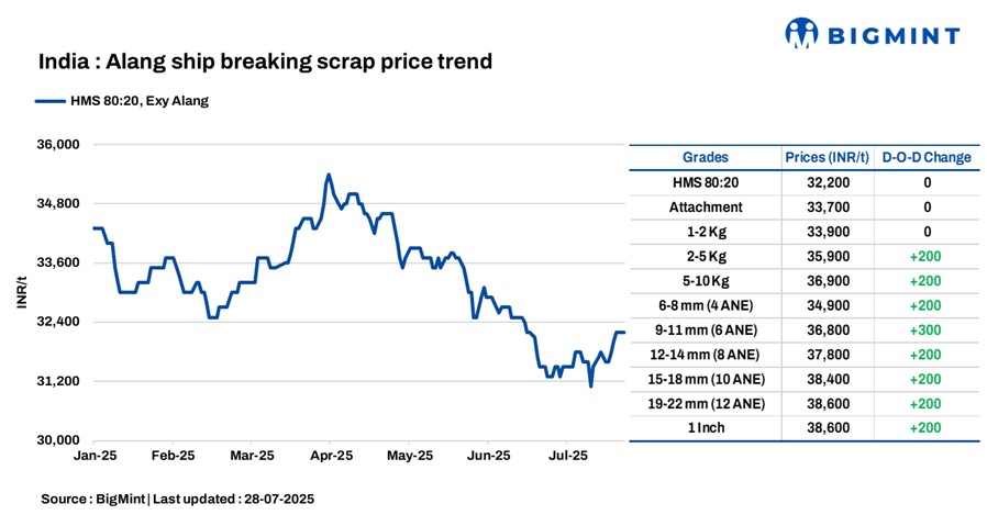 Ship-breaking scrap prices in Alang, Gujarat, were stable d-o-d for the second consecutive day. BigMint assessed HMS (80:20) prices at INR 32,200/t ($372/t) ex-yard. With finished steel prices remaining steady and moderate trade activity seen in the previous session, scrap suppliers kept their offers firm today.