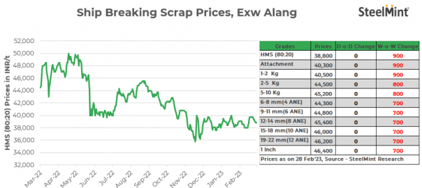 In Gujarat’s Alang, ship-breaking melting scrap prices remained stable d-o-d on 28 Feb’23, as per SteelMint’s assessment. HMS (80:20) prices are assessed at INR 38,800/t exy. Steady semi-finished steel prices in Gujarat during the last trading session and moderate buying inquiries for scrap in the region prompted suppliers to keep offers stable today.