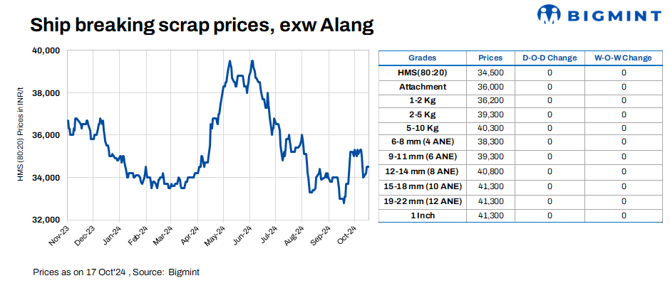 Ship-breaking melting scrap prices in Alang, Gujarat, remained stable d-o-d on 17 Oct’24. According to BigMint’s assessment, HMS (80:20) prices were at INR 34,500/t ($411/t) ex-yard. Though semi-finished steel prices decreased in yesterday’s trading session in the region, moderate buying inquiries for scrap by Bhavnagar-based IF steel mills prompted suppliers to keep offers stable today.
