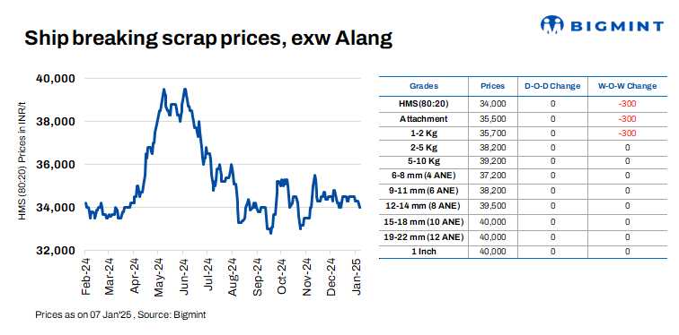 Ship-breaking melting scrap prices in Alang, Gujarat, remained stable d-o-d on 7 Jan’25. According to BigMint’s assessment, HMS (80:20) stood at INR 34,000/t ($397/t) ex-yard. Prices of semi-finished and finished steel were largely steady in yesterday’s trading session in the region. This, along with moderate trade activities for scrap, prompted suppliers to keep their offers firm today.