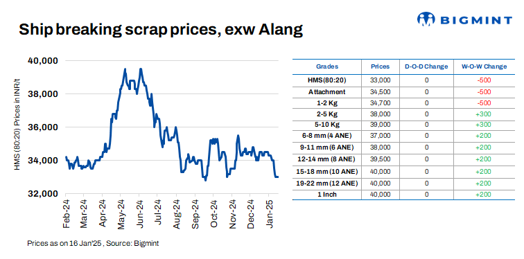 Ship-breaking melting scrap prices in Alang, Gujarat, remained firm d-o-d on 16 Jan’25. According to BigMint’s assessment, HMS (80:20) prices were at INR 33,000/t ($382/t) ex-yard. Prices of semi-finished and finished steel remained stable during yesterday’s trading session in the region. This, along with moderate trade activities for scrap, prompted suppliers to keep their offers unchanged today.