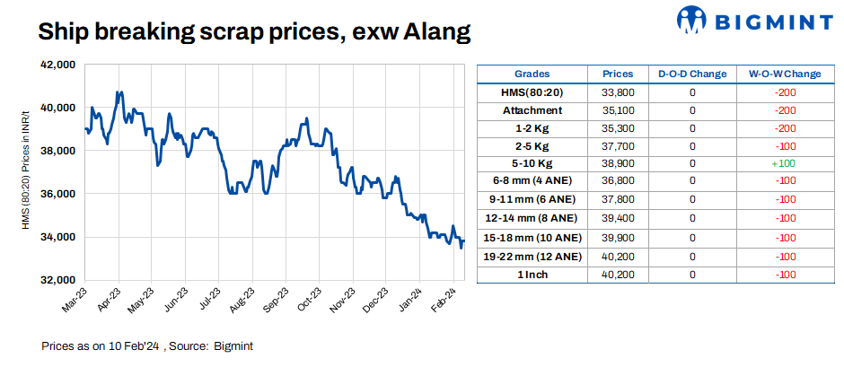 Ship-breaking melting scrap prices in Alang, Gujarat, remained stable d-o-d on 10 Feb’24. As per BigMint’s assessment, HMS (80:20) prices stood at INR 33,800/t exy. Semi-finished steel prices in Gujarat remained almost stable in the last trading session, coupled with moderate buying inquiries for scrap in the region. This prompted scrap suppliers to maintain firm offers today.