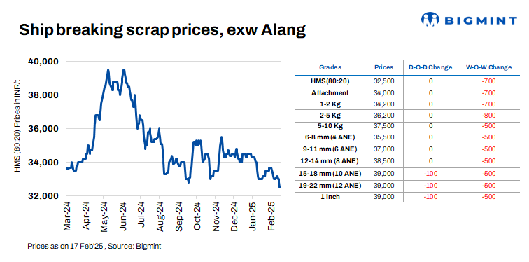 Ship-breaking melting scrap prices in Alang, Gujarat, remained stable d-o-d on 17 Feb’25. According to BigMint’s assessment, HMS (80:20) stood at INR 32,500/t ($375/t) ex-yard. Prices of semi-finished and finished steel remained largely steady in the previous trading session. This, along with moderate trade activity in scrap, prompted suppliers to maintain stable offers today.
