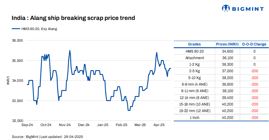 Ship-breaking melting scrap prices in Alang, Gujarat, remained stable d-o-d on 26 Apr’25. According to BigMint’s assessment, HMS (80:20) stood at INR 34,600/t ($405/t) ex-yard. During yesterday’s trading session, semi-finished and finished steel prices held steady in the region, and trade activity was moderate. This price stability led scrap suppliers to keep their offers stable for today.