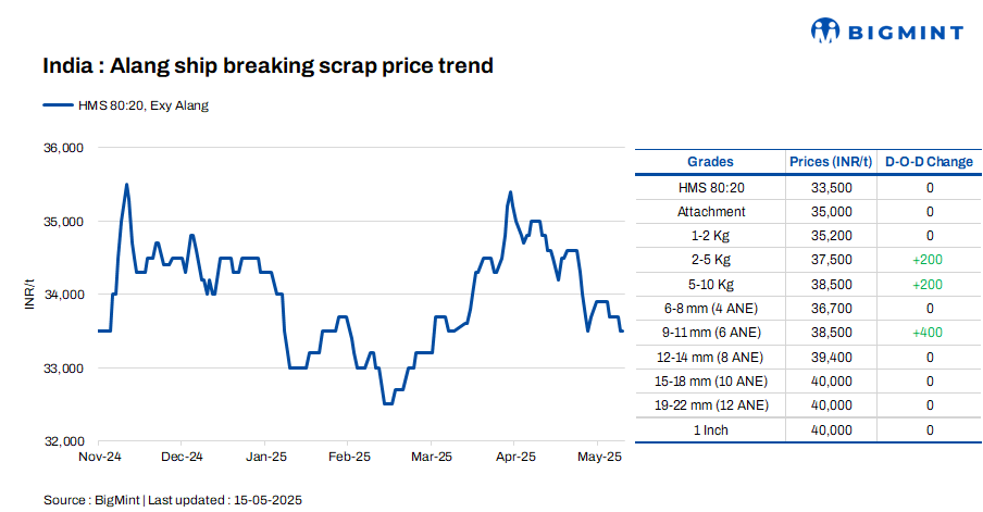 Ship-breaking melting scrap prices in Alang, Gujarat, remained stable d-o-d on 15 May’25. According to BigMint’s assessment, HMS (80:20) prices were at INR 33,500/t ($391/t) ex-yard. During yesterday’s trading session, semi-finished and finished steel prices held steady in the region, and trade activity remained moderate. This price stability led scrap suppliers to keep their offers stable for today.