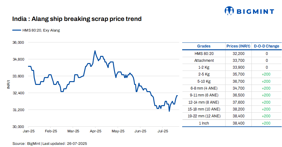 Ship-breaking melting scrap prices in Alang, Gujarat, remained stable d-o-d on 26 Jul’25. According to BigMint’s assessment, HMS (80:20) prices were at INR 32,200/t ($372/t) ex-yard. Trade activity in both semi-finished and finished steel slowed during yesterday’s trading session, compared to the past few days. This, along with moderate trade activities for scrap, prompted suppliers to keep their offers stable today.