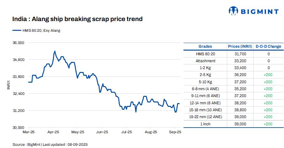 Ship-breaking melting scrap prices in Alang, Gujarat, remained stable d-o-d on 8 Sep’25. According to BigMint’s assessment, HMS (80:20) prices were at INR 31,700/t ($360/t) ex-yard. The regional market witnessed average trade volumes in semi-finished and finished steel in the previous trading session. Furthermore, moderate scrap procurement interest from Bhavnagar-based IF mills led suppliers to maintain stable pricing today.