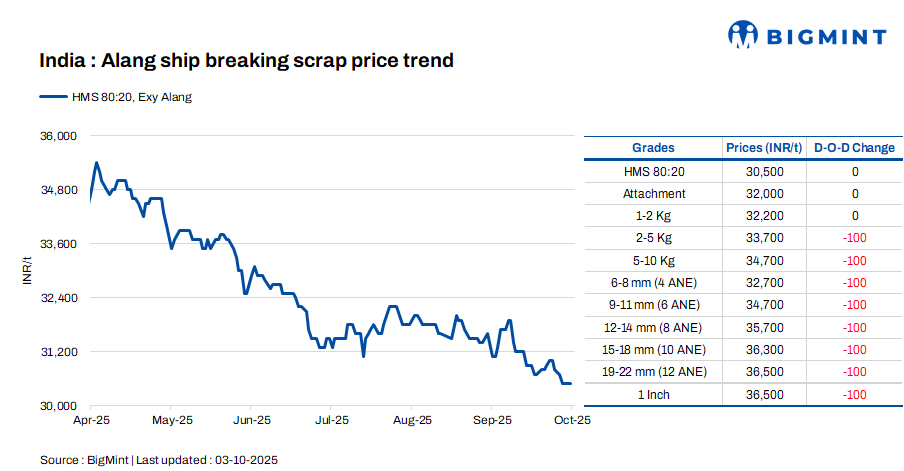 Ship-breaking melting scrap prices in Alang, Gujarat, remained stable d-o-d on 3 Oct’25. According to BigMint’s assessment, HMS (80:20) prices were at INR 30,500/t ($344/t) ex-yard. Average trade activity was observed for semi-finished and finished steel during previous trading session in the region. Additionally, moderate buying inquiries for scrap by the Bhavnagar-based IF steel mills prompted suppliers to keep offers stable today.