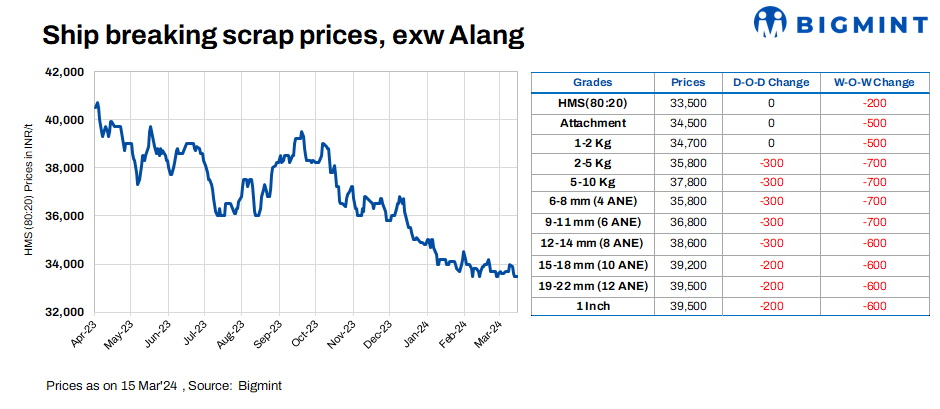 Ship-breaking melting scrap prices in Alang, Gujarat, remained stable d-o-d on 15 Mar’24. As per BigMint’s assessment, HMS (80:20) prices stood at INR 33,500/t exy. The demand in semi-finished and finished was at limited level in the yesterday’s trading session in the region along with moderate trading activity in the scrap prompted suppliers to keep offers firm today.