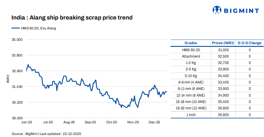 Ship-breaking melting scrap prices in Alang, Gujarat, remained unchanged d-o-d on 22 Dec’25. According to BigMint’s assessment, HMS (80:20) prices were at INR 31,000/t ($346/t) ex-yard. Semi-finished and finished steel prices held largely steady in the previous trading session in the region. That apart, moderate trade activity in scrap prompted suppliers to keep their offers firm today.