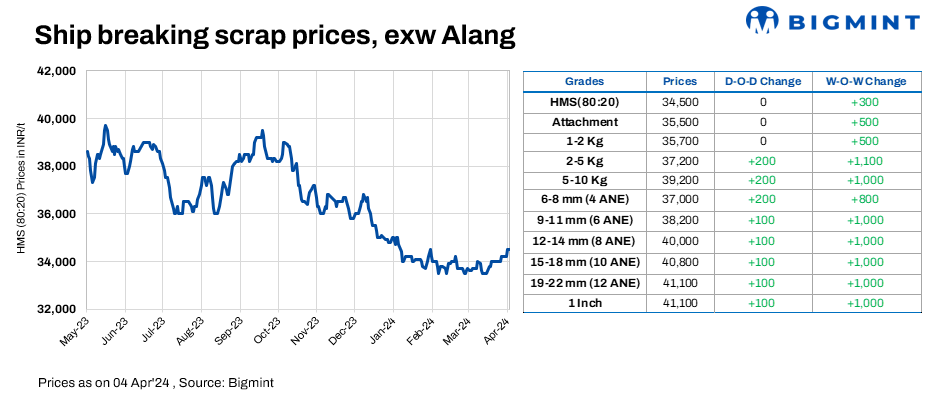 Alang, Gujarat, saw unchanged ship-breaking melting scrap prices on 4 April, 2024. BigMint’s assessment pegged HMS (80:20) prices at INR 34,500/t ($413/t) ex-yard. Semi-finished and finished steel trade remained subdued in the region during yesterday’s session, with moderate demand for scrap, prompting suppliers to maintain their price levels today.