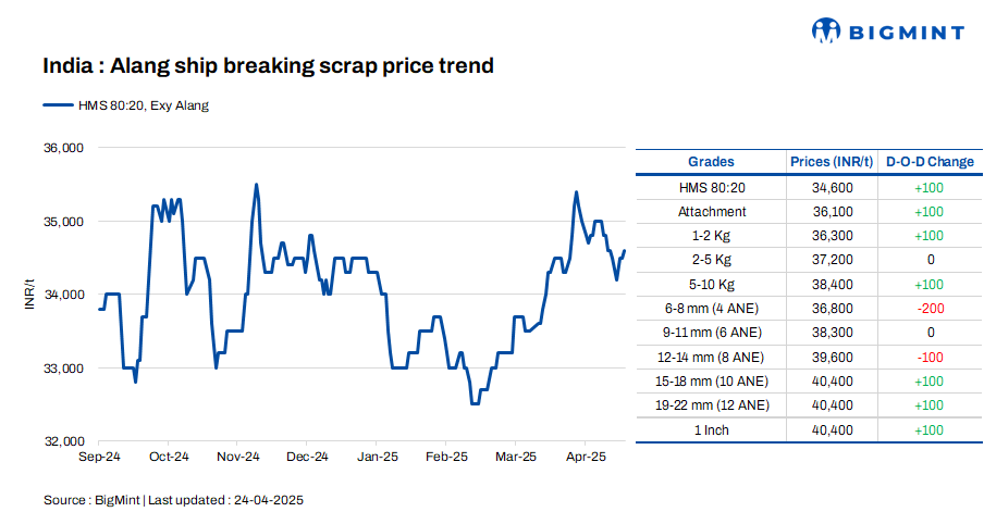 Ship-breaking melting scrap prices in Gujarat’s Alang market rose by INR 100/t d-o-d on 24 Apr’25, as per BigMint’s assessment. HMS (80:20) prices were assessed at INR 34,600/t ($404/t) exy. Trade activities in semi-finished and finished steel increased in the late hours of yesterday’s trading session in the region. Additionally, decent buying inquiries for scrap prompted suppliers to increase their offers today.