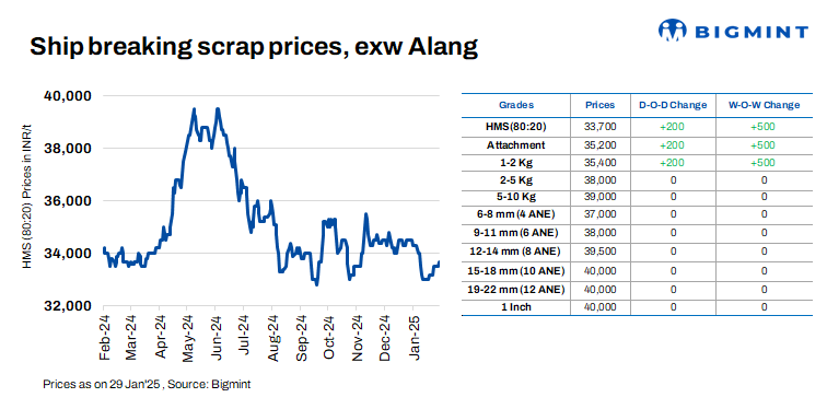 Ship-breaking melting scrap prices in Gujarat’s Alang market rose by INR 200/t d-o-d on 29 Jan’25, as per BigMint’s assessment. HMS (80:20) prices were assessed at INR 33,700/t ($389/t) exy. The hike comes as semi-finished and finished steel prices in the region increased by approximately INR 300/t in yesterday’s trading session. Active inquiries for scrap further encouraged suppliers to raise their offers today.