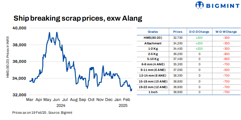 Ship-breaking melting scrap prices in Gujarat’s Alang market rose by INR 200/t d-o-d on 19 Feb’24, as per BigMint’s assessment. HMS (80:20) prices were assessed at INR 32,700/t ($376/t) exy. The price hike comes as semi-finished steel prices in the region increased by approximately INR 300/t in yesterday’s trading session. Active buying inquiries for scrap further encouraged suppliers to raise their offers today.