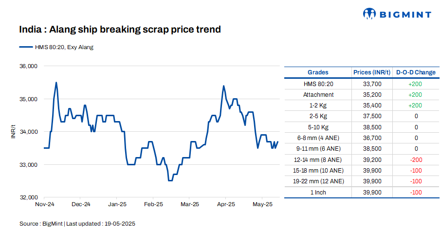 Ship-breaking melting scrap prices in Gujarat’s Alang market rose by INR 200/t d-o-d on 19 May’25, as per BigMint’s assessment. HMS (80:20) prices were assessed at INR 33,700/t ($394/t) exy. Trade activities in semi-finished and finished steel increased in the late hours of previous trading session in the region. Additionally, decent buying inquiries for scrap prompted suppliers to increase their offers today.