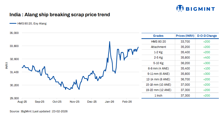 Ship-breaking melting scrap prices in Gujarat’s Alang market rose by INR 200/t d-o-d on 23 Feb’26, as per BigMint’s assessment. HMS (80:20) prices were assessed at INR 33,700/t ($372/t) exy. The regional market witnessed active trading, supported by an INR 100-200/t rise in semi-finished and finished steel prices in the previous trading session. Improved inquiries for scrap prompted suppliers to raise their offers today.
