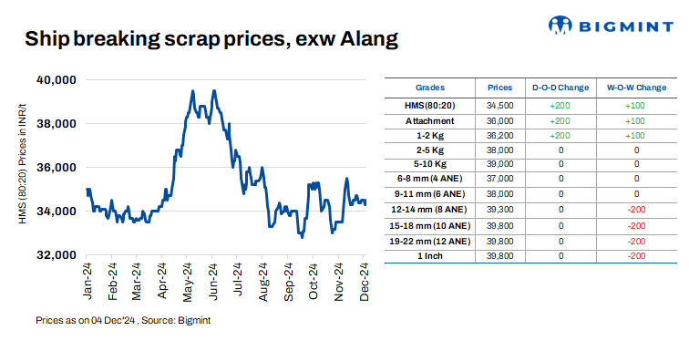 India’s ship-breaking melting scrap prices in Gujarat’s Alang market rose INR 200/t d-o-d on 4 Dec’24, as per BigMint’s assessment. HMS (80:20) stood at INR 34,500/t ($408/t) exy. Robust trade in the semi-finished and finished steel sectors during yesterday’s session led to an uptick in scrap activity. This, along with decent inquiries for scrap from Bhavnagar-based mills, prompted suppliers to raise their offers today.