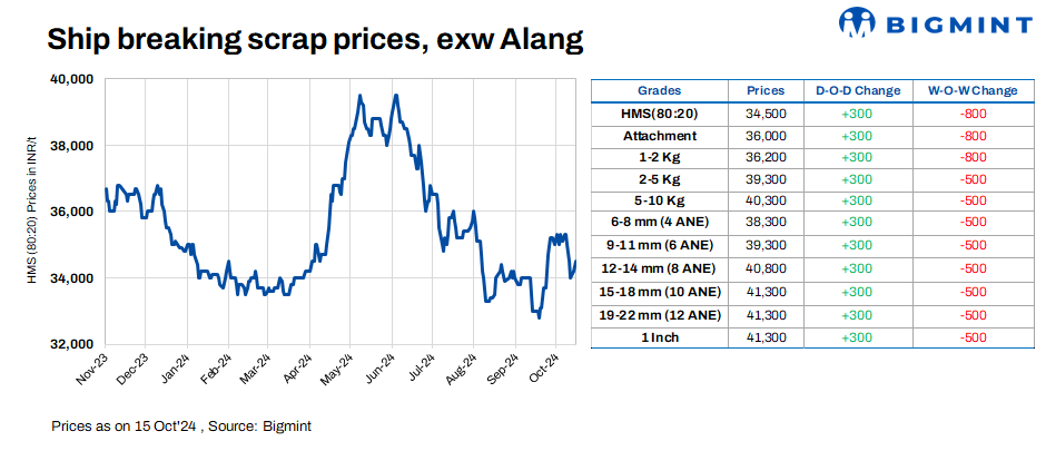 Ship-breaking melting scrap prices in Gujarat’s Alang market inched up by INR 300/t d-o-d on 15 Oct’24, as per BigMint’s assessment. HMS (80:20) prices were assessed at INR 34,500/t ($410/t) exy. Semi-finished steel prices increased by INR 400-500/t in the region during yesterday’s trading session. This, along with decent buying inquiries for scrap from Bhavnagar-based mills, prompted suppliers to raise their offers today.