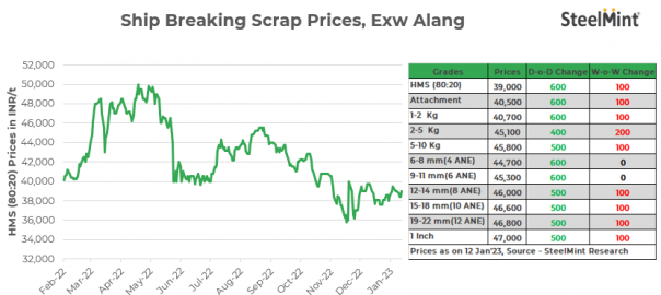 Ship-breaking melting scrap prices in Gujarat’s Alang market rose by INR 600/t d-o-d on 12 Jan’23. As per SteelMint’s assessment, HMS (80:20) prices stand at INR 39,000/t ex-yard. An increase in semi-finished steel prices in yesterday’s trading session, along with active buying interest for scrap by the induction furnace mills in Bhavnagar pushed scrap suppliers to hike their offers, sources informed.