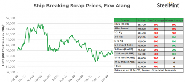 Ship-breaking melting scrap prices fell sharply by INR 800/t d-o-d in Gujarat’s Alang market on 19 Jan’23. As per SteelMint’s assessment, HMS (80:20) prices stand at INR 38,700/t exy. Lower bids and limited trade volumes along with a sharp drop in semi-finished steel prices in yesterday’s session forced scrap suppliers to cut their offers, as per sources.