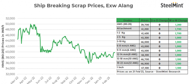 Ship-breaking melting scrap prices in Alang, Gujarat opened stable d-o-d today. As per SteelMint’s assessment, HMS (80:20) prices stand at INR 39,700/t exy. Limited buying inquiries for semis in yesterday’s trading session, and decent scrap trading volumes at current price levels prompted suppliers to keep offers stable.