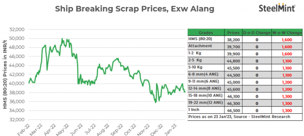 Ship-breaking melting scrap prices remained stable d-o-d today in Gujarat’s Alang market. As per SteelMint’s assessment, HMS (80:20) prices stand at INR 38,200/t exy. Moderate trade in the semi-finished and finished steel segments in the last trading session and limited buying enquiries for scrap prompted suppliers to keep offers stable.