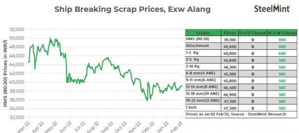 Ship-breaking melting scrap prices remained stable d-o-d on 2 Feb’23 in Gujarat’s Alang market. As per SteelMint’s assessment, HMS (80:20) prices stand at INR 39,100/t exy. Largely stable semi-finished steel prices and moderate buying inquiries for scrap in the last trading session prompted suppliers to keep offers stable today.