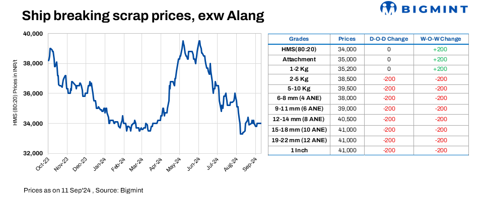 On 11 Sep’24, Alang’s ship-breaking melting scrap prices remained unchanged for the fifth consecutive day, with HMS (80:20) prices holding firm at INR 34,000/t ($405/t) ex-yard, according to BigMint. Although prices of semi-finished steel were stable yesterday, steady buying interest from Bhavnagar-based IF steel mills led suppliers to maintain the current prices.
