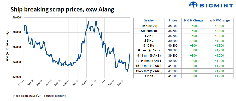 Ship-breaking melting scrap prices in Gujarat’s Alang market surged by INR 500/t d-o-d on 26 Sep’24, as per BigMint’s assessment. HMS (80:20) prices were assessed at INR 35,200/t ($421/t) exy. In yesterday’s trading session, semi-finished steel prices rose INR 500/t in the region. Concurrently, limited scrap supply and strong demand from Bhavnagar-based mills led suppliers to raise their offers today.