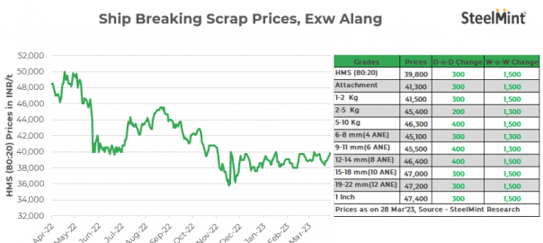 Ship-breaking melting scrap prices opened higher by INR 300/t d-o-d today in the Gujarat’s Alang market. HMS (80:20) prices currently stand at INR 39,800/t exy. Suppliers raised offers following of a sharp hike in semi-finished steel prices by INR 1,100/t in Bhavnagar (INR 48,300/t DAP) in the yesterday’s session. Meanwhile active buying inquiries for scrap also supported prices.