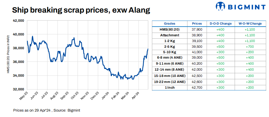 Ship-breaking melting scrap prices in Gujarat’s Alang rose by INR 400/t d-o-d on 29 Apr’24, as per BigMint’s assessment. HMS (80:20) prices were assessed at INR 37,900/t ($454/t) exy. Due to fewer ships/vessels arriving for dismantling in Alang there is a shortage of scrap in the region. Also, moderate trades in semi-finished steel prompted scrap suppliers to increase their offers today.
