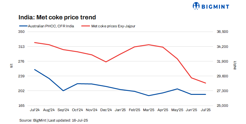 As of 16 July, BF-grade (25-90 mm) metallurgical coke (met coke) prices in India saw a modest upward movement. BigMint assessed prices at INR 29,000/tonne (t) ex-Jajpur, reflecting a w-o-w increase of INR 500/t.